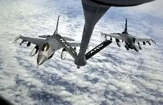 ![]() Two F-16s from Aviano Air Base, Italy, after fueling from a KC-135 Stratotanker over the Adriatic Sea | |