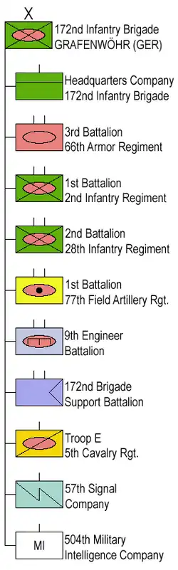 The brigade was a separate unit and did not report to a higher division-level headquarters, but instead reported directly to the V Corps of United States Army Europe. The Headquarters and Headquarters Company of the unit was located at Grafenwöhr, Germany.[2] The Unit also contained the 1st Battalion, 2d Infantry,[3] the 2nd Battalion, 28th Infantry,[4] the 1st Battalion, 77th Field Artillery,[5] the 9th Engineer Battalion,[6] the 3rd Battalion, 66th Armor,[7] and the 172nd Forward Support Battalion.[8] In addition, the brigade contained three independent companies; 504th Military Intelligence Company,[9] and Echo Troop, 5th Cavalry Regiment,[10] the 57th Signal Company.[11] All of these subordinate units were last located in Grafenwöhr.[12]