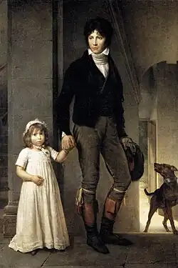 With this Classical style came the willingness to expose the breast. With the new iconography of the Revolution as well as a change in emphasis on maternal breast-feeding, the chemise dress became a sign of the new egalitarian society.[50] The style was simple and appropriate for the comfort of a pregnant or nursing woman as the breasts were emphasized and their availability was heightened. Maternity became fashionable and it was not uncommon for women to walk around with their breasts exposed. Some women took the "fashionable maternity" a step further and wore a "six-month pad" under their dress to appear pregnant.[51]