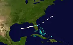 A moderately strong hurricane with winds of 105 mph (165 km/h) was first spotted on October 6 east of Jamaica. Passing a short distance south of the island, the hurricane tracked northwestward and brushed the Yucatán Peninsula before turning north-northeastward into the Gulf of Mexico.[1] Late on October 9, it made landfall a short distance east of Apalachicola, Florida, at peak winds with an estimated pressure of 965 mbar (28.5 inHg).[14] Rapidly weakening to tropical storm status, the cyclone continued northeastward and emerged into the Atlantic Ocean from North Carolina on October 11. Later that day, it was last observed about 250 mi (400 km) southeast of Cape Cod.[1]