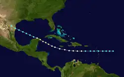 The final tropical cyclone was first observed at 0000 UTC on September 24, while located about 420 miles (680 km) east of Guadeloupe. Initially a tropical storm, it strengthened slightly before crossing the Leeward Islands on September 25.[7] In Guadeloupe, several ships at the port in Basseterre were swept out to sea.[15] Continuing eastward, the storm soon entered the Caribbean Sea. Early on September 26, the system strengthened into a hurricane.[7] By September 28, it was west of the Cayman Islands and had reached Category 2 strength. The storm weakened to a tropical storm after passing Cancún early on September 29 and impacted the Gulf coastline, near the United States–Mexico border, at that strength the next day before dissipating.[7] At Port Isabel, Texas, several hundred homes were swept away, and several towns near the mouth of the Rio Grande also sustained damage.[16]