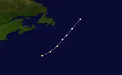 The second known storm of the season was discovered in contemporary reanalysis. It existed in the northwestern Atlantic in the middle of August with the only evidence of the storm being reports from two vessels in the vicinity of bad weather. One vessel, the Tornado, encountered severe winds, starting on August 17, which forced her to abandon her easterly course and sail into New York City. The Caure also experienced strong winds on August 18 and August 19 with a barometric pressure as low as 982 mbar (29.0 inHg).[4][6] A standard wind–pressure relationship model for that value yields winds of 80 mph (130 km/h). The wind patterns reported by each ship indicate that neither vessel reached the storm's core, where winds are typically at their strongest. As a result, the system is estimated to have attained at least Category 2 intensity.[6] Its approximate track follows an east-northeasterly trajectory.[5]