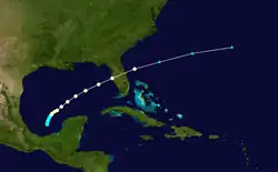 A low pressure area developed over the Bay of Campeche between October 23 and October 24,[6] with a tropical storm forming on the latter date. At least four other ships in that portion of the Gulf of Mexico sustained appreciable structural damage. One ship capsized in the storm with all hands lost except one seaman, who was picked up on November 2 by a passing vessel. The survivor said he was stranded on the wreck for five days, indicating that his ship went down on October 28. Stormy weather was reported near Bermuda. Partagás and Diaz used these reports to create a track for the storm.[13] Initially, the storm drifted north-northeastward and northeastward. By 12:00 UTC on October 26, it was estimated that the system became a hurricane and intensified slightly further to peak at winds of 90 mph (150 km/h).[5] Shortly thereafter, the hurricane began accelerating east-northeastward due to a cold front. At 18:00 UTC on October 28, the storm made landfall near St. Petersburg, Florida.[6] A barometric pressure of 974 mbar (28.8 inHg) was observed,[6] the lowest in relation to the storm. The storm emerged in the Atlantic less than six hours later and transitioned into an extratropical cyclone early on October 29.[5]