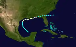 Although the Monthly Weather Review reported decreasing atmospheric pressures over the Gulf of Mexico as early as the night of September 12,[6] the track for this storm begins on September 14 about 110 mi (175 km) west-northwest of the Yucatán Peninsula. Initially moving northwestward, the cyclone turned northward on September 16, roughly 24 hours before it intensified into a hurricane. Later on September 17, the hurricane curved east-northeastward while just offshore Texas.[3] At 16:00 UTC the next day, the storm made landfall to the southwest of Cocodrie, Louisiana, with maximum sustained winds of 80 mph (130 km/h) and an estimated minimum pressure of 982 mbar (29.0 inHg).[3][4] On September 19 the hurricane made another landfall at Fort Walton Beach, Florida. It quickly weakened back to a tropical storm while still in the state of Florida. After emerging into the Atlantic on September 20, the storm was last noted the next day roughly 175 mi (280 km) southeast of Cape Fear, North Carolina.[3]
