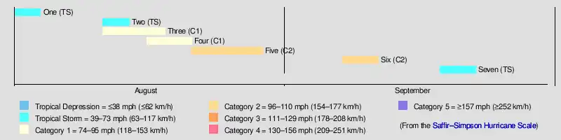 Based on observations, the track of the first known system begins over the southeastern Gulf of Mexico on August 1.[8] A few days later, the storm struck the Gulf Coast of the United States and caused flooding in the region.[5][8] Four other cyclones formed in August, all but one of which made landfall. Most notably, the season's fifth cyclone peaked as a Category 2 hurricane on the Saffir–Simpson scale with sustained winds of 105 mph (165 km/h) and a minimum atmospheric pressure of 970 mbar (29 inHg).[5] That storm caused several deaths due to maritime incidents prior to making landfall in Georgia.[9][10] Overall, it caused more than $1.7 million in damage and approximately 700 fatalities,[11][12][13] making it one of the deadliest cyclones in the United States. At the time, this storm ranked as the country's second deadliest, behind only the 1875 Indianola hurricane.[13]