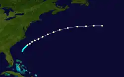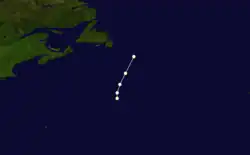 The brig Belle of the Bay encountered a severe gale north of the Bahamas on September 24.[25] Consequently, the track listed in HURDAT begins that day as a tropical storm approximately 275 mi (445 km) east of Jacksonville, Florida. The storm moved slowly northeastward and intensified into a hurricane with maximum sustained winds of 80 mph (130 km/h) on September 25,[7] based on reports from the ships R.A. Allen and Sedmi Dubrovacki.[4] By September 27, the hurricane curved east-northeastward and was last seen on the following day roughly 555 mi (895 km) to the southeast of Cape Race, Newfoundland.[7] The reanalysis study by Chenoweth argued that this storm instead formed over the central Atlantic on September 22. He also proposed that the system moved around Bermuda and later passed through the Azores before becoming extratropical on September 30.[6]