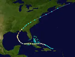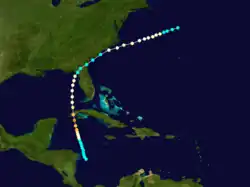 This storm was first observed on October 5 over the southwestern Caribbean.[26] Trekking slowly north-northwestward, the cyclone is estimated to have intensified into a hurricane on October 7,[7] one day before the barks Tamora and Sadie reported hurricane conditions.[26] The storm strengthened into a major hurricane later on October 8,[7] before making landfall in Cuba early the next day near Boca de Galafre in Pinar del Río Province.[7] A reanalysis by meteorologist Ramón Pérez Suárez estimated sustained winds at 140 mph (220 km/h), making it a Category 4 hurricane.[4] The cyclone weakened greatly over the island, quickly falling to Category 1 status and never recovering while moving northward over the Gulf of Mexico. It made landfall near Horseshoe Beach, Florida, with winds of 80 mph (130 km/h) at 04:00 UTC on October 11 and weakened to a tropical storm a few hours later while moving northeastward. The storm emerged into the Atlantic from the coast of Georgia late on October 11 and re-strengthened into a hurricane by the following day. However, the cyclone weakened back to a tropical storm on October 15 and was last noted several hours later about 350 mi (560 km) southeast of Nantucket, Massachusetts.[7] Chenoweth extended the duration of the cyclone until October 18, with it moving erratically offshore the northeastern United States for a few days.[6]