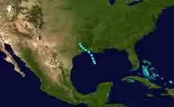 This storm, added to HURDAT in 2003, was first observed at Lake Charles, Louisiana, and Sabine Pass, Texas, on September 14.[4] A tropical depression, it quickly strengthened into a tropical storm while moving northwestward. At 05:00 UTC on September 15, the storm made landfall just east of the Louisiana–Texas state line with maximum sustained winds estimated at 60 mph (95 km/h). Early the next day, the cyclone weakened to a tropical depression and dissipated near Grapeland, Texas.[7] Chenoweth's reanalysis study proposed that this system formed over the Bay of Campeche on September 11 and made landfall slightly farther west, near Port Arthur, Texas, on September 15.[6] Port Eads, Louisiana, recorded winds of 70 mph (110 km/h) and a pressure of 995 mbar (29.38 inHg).[20] In Sabine Pass, Texas, the storm flooded streets with about 3 ft (0.91 m) of water, toppled fences, and damaged some homes, with one destroyed, injuring its occupant.[11]