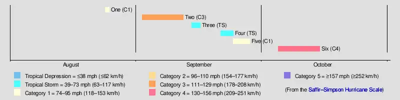 The first system of the season is known, from ship reports, to have been active in the north Atlantic on August 24 and August 25. September featured four cyclones, with two tropical storms and two hurricanes. One of them, the season's second storm, struck the Bahamas, Cuba, and Florida at hurricane intensity.[7] An unknown number of deaths occurred in Cuba.[8] Later, the storm caused $100,000 in damage in Cedar Key, Florida, alone, while a tornado in the state killed one person.[9][10] The season's third system inflicted some damage at Sabine Pass, Texas,[11] and the fourth cyclone flooded the East Coast of the United States from North Carolina to Massachusetts.[12] In October, the sixth, final, and strongest storm of the season made landfall in western Cuba at peak intensity as a Category 4 hurricane with maximum sustained winds of 140 mph (220 km/h).[7] Thousands of buildings and homes were damaged or destroyed.[13] At least $5,000 in damage occurred in North Florida after the storm struck the Nature Coast as a hurricane.[10] Overall, the cyclone, which was last noted on October 15,[7] killed 140 people.[14]