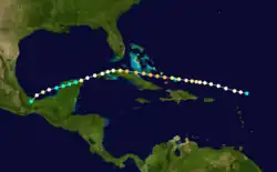 The steamship Jamaica first encountered this system on August 31 about 150 mi (240 km) northeast of Sombrero, an outlying island of Anguilla.[7] Initially a tropical storm, the system strengthened to a hurricane later that day. The storm intensified further, reaching Category 2 intensity prior to striking the Turks and Caicos Islands around 18:00 UTC on September 2. About 24 hours later, the cyclone peaked as a Category 3 hurricane with maximum sustained winds of 125 mph (205 km/h). On September 4, the storm made landfall along the coast of modern-day Villa Clara Province. Weakening to a Category 1 hurricane by early on the following day, the system turned southwestward over Cuba and remained over land until emerging into the Yucatán Channel several hours later. The hurricane then crossed the channel and made landfall near the northeastern tip of the Yucatán Peninsula on September 6. After weakening to a tropical storm, it briefly re-strengthened into a Category 2 hurricane while moving southwestward in the Bay of Campeche. Thereafter, the storm weakened back to a Category 1 prior to its landfall near Coatzacoalcos, Veracruz, early on September 8 and soon dissipated.[5] A reanalysis study by Chenoweth argued that this cyclone actually developed as a tropical depression near the Cabo Verde Islands on August 25 and later may have clipped the north coast of the Yucatán Peninsula instead of moving across it, striking the Mexican mainland as a major hurricane.[4]