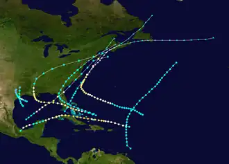 | Nine | November 17–25 | Category 2 hurricane | 100 (155) | ≤982 | East Coast of the United States, Atlantic Canada | Unknown | 16 | [43][44] | ||