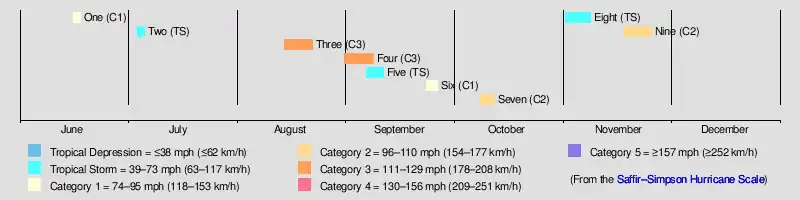 | 9 systems | June 16 – November 25 | 125 (205) | 945 | >$1 million | 958 | |||||