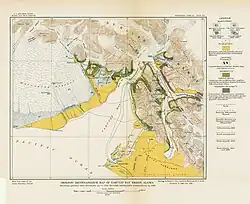 During September 1899 there was a series of severe earthquakes in the region around Yakutat Bay in Alaska. The most powerful of these occurred on September 3 and September 10 at about noon, local time. The area was sparsely populated and no fatalities were recorded, but the earthquakes were notable for the degree of elevation recorded, up to 47 feet, and for the effects on the glaciers in the region. Fieldwork on the effects of the earthquake was carried out between 1905 and 1910, and a summary report was published in 1912.[3] The September 3rd large shock's magnitude is debated, but it ranges from 8.2–8.5.[1][2] The second earthquake on September the 10th was also a comparably large shock, with magnitudes ranging from 8.2–8.6.[1][2]