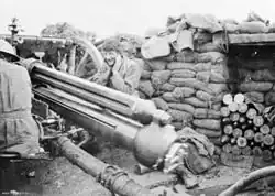 Battlefield experience in 1914 and 1915 showed up the weakness of the original recuperator springs (which returned the barrel to firing position after recoil) and loss of oil in the recuperator under intense firing. Poor quality of wartime manufacture of the springs was also a factor.[22] Spring shortages due to breakages meant guns remained in the firing line and had to be "run up" – have the barrel moved forward into its firing position – by hand, hence slowing the rate of fire.[23] A temporary preventive measure was the addition of a distinctive armoured box-shaped oil reservoir to the front end of the recuperator to maintain the oil supply and extend spring life. This modification is visible in many photographs of 18-pounders in action on the Western Front right up to the end of the war