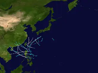 No storms were recorded between January and April. The first storm of the year was a tropical storm that formed on May 19 and dissipated on May 24. Multiple typhoons formed across the Philippine archipelago in the following months. Another powerful storm formed on July 23, which caused damage to a camp and led to three indirect fatalities. The last storm formed on November 7 and dissipated on November 11.