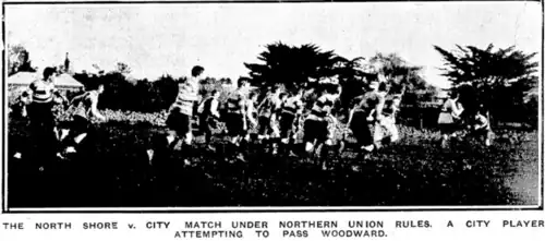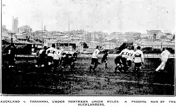 A further meeting was held at North Shore on the Wednesday evening at the Council Chambers in Devonport with 40 in attendance, and a club was formed. It was noted that they had the playing numbers for two teams and they had "taken the pick of the amateur players of the district club". The club would be called North Shore Albions. On the Thursday night a preliminary meeting was held in the city with 20 players attending with the goal of forming a club that was either a city team or a combination of a city and Ponsonby team, while a Newton club was also aimed to be formed the following week as there was "considerable dissatisfaction among the members at the management of the Auckland Union".[4] It was decided to play a match on the Saturday between the North Shore team and the city team. The match was duly played between North Shore and City and resulted in a win to the former by 44 points to 22.[5]