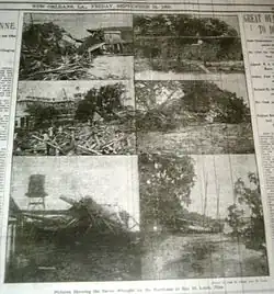 In New Orleans, the storm caused substantial damage, with many homes destroyed and ships wrecked.[17] Communication with the city was completely lost after most of the telegraph wires were downed. Around 3:00 pm on September 21, advisories from the New Orleans Weather Bureau ceased, leading to concerns over the state of the city. Prior to the communication loss, the Weather Bureau reported that waves along the Mississippi River banks were surpassing 3 ft (0.91 m) and water rise in New Orleans itself could reach unprecedented levels. Several lakes overflowed their banks as water from the Mississippi River back-flowed into them, flooding nearby lowlands.[18] The resulting floods, which inundated areas with upwards of 10 ft (3.0 m) of water,[3] were similar in scale to the flooding caused by Hurricane Katrina in 2005, nearly 100 years later. However, due to the lack of residential buildings in the area at the time, the flooding caused far less destruction than that of Katrina.[19] A report falsely claimed that the city's French Quarter was "swept away". A total of 306 coal barges sank off the coast of New Orleans and Lobdell (West Baton Rouge Parish), incurring over $1 million in losses.[17] Nearly every sugar cane plantation between New Orleans and Baton Rouge sustained damage, resulting in at least $1 million in losses.[20]