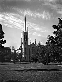 First Presbyterian Church on Lafayette Square, destroyed by the great hurricane of 1915, collapsing at 5:02pm.[18]