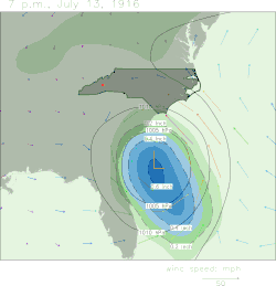![]() Surface weather analysis of the hurricane over Charleston on July 14 | |