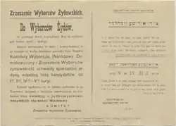 Some Jewish national activists perceived the Polish-Jewish pact as a betrayal and decided to contest the Sixth Curia election in order to "save Jewish honor". A stormy meeting was held at the premises of the Association of Jewish Writers and Journalists on Tłomackie Street, during which the Jewish Popular Electoral Committee ('Folkskomitet') was founded. The committee was headed by Noach Pryłucki.[6][4] For the Folkists the real percentage of Jewish voters in the first five curiae were much greater than the proportion of Jewish seats allocated through the Polish-Jewish pact (the Folkists desired that 35% of the City Council seats be allocated to Jews).[8] The Polish-Jewish pact was also rejected by some Orthodox Jews.[9]