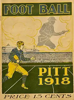 "Although 1918 was a war year, and many problems threatened from time to time to put an end to college athletics., Pitt stuck manfully to the ship and 'Kept the Home Fires Burning'. With the exception of baseball, which was abolished due to lack of interest, hardly directly chargeable to war conditions, the other major sports—football, basketball and track—were kept going."[7] "Football had a hard row to hoe in 1918." Only five games were actually played due to the war and pandemic sweeping the nation. "The usual training trip to 'Camp Hamilton,' Windber, Pa. was dispensed with." The one year residence rule was called off by all the big schools, which helped bolster their rosters since the army had depleted them. After numerous shifts were made to the schedule, due to the government imposed quarantine, only three of the original games scheduled were played -Washington & Jefferson, Penn and Penn State. Georgia Tech was played for the benefit of the War Charities, and was the highlight of the season. $25,000 was donated from the proceeds of the game. Pitt played a post season game against the Cleveland Naval Reserves and lost by one point. "It was a most unsatisfactory game in many ways and marred Pitt's record of straight victories started in 1915."[8]