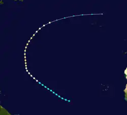 The first known storm of the season was initially identified on September 7 as a 40 mph (64 km/h) tropical storm over Atlantic Ocean. Traveling towards the northwest, the storm gradually intensified, attaining hurricane-status late on September 9.[4] The following day, a ship in the vicinity of the storm recorded a pressure of 985 mbar (hPa), the lowest pressure recorded in relation to the storm.[5] Around 1200 UTC, the hurricane turned towards the north and intensified into a modern-day Category 2 hurricane on the Saffir–Simpson scale early on September 11. The storm continued to intensify through September 12 when it reached its peak intensity with winds of 110 mph (180 km/h). After maintaining this intensity for 18 hours, the hurricane began to weaken as it turned towards the northwest. By 0000 UTC on September 14, the storm weakened to a Category 1 hurricane. The system began to undergo an extratropical transition, completing the process early the next day. The system tracked nearly due east before dissipating on September 16 to the north of the Azores islands.[4]