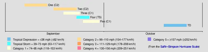Of the season's six tropical cyclones, five became tropical storms and four strengthened into hurricanes. Furthermore, none of these strengthened into a major hurricane—Category 3 or higher on the modern-day Saffir–Simpson hurricane wind scale—marking the seventh such occurrence since 1900.[2] The strongest hurricane of the season peaked as only as a strong Category 2 with winds of 110 mph (180 km/h). The second hurricane caused one death and $1.45 million (1920 USD) in damage in Louisiana, the third left one fatality in North Carolina, and the fifth storm indirectly killed one person in Florida.