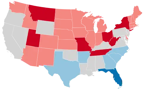 | 1920 presidential election results. Red denotes states won by Harding, blue denotes states won by Cox. Numbers indicate the electoral votes won by each candidate. | |