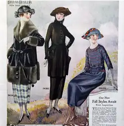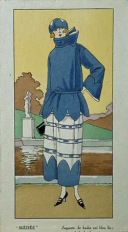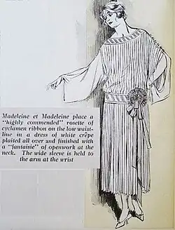 Paris set the fashion trends for Europe and North America.[5] The fashion for women was all about letting loose. Women wore dresses all day, every day. Day dresses had a drop waist, which was a belt around the low waist or hip and a skirt that hung anywhere from the ankle on up to the knee, never above. Daywear had sleeves (long to mid-bicep) and a skirt that was straight, pleated, hank hem, or tiered. Hair was often bobbed, giving a boyish look.[6]