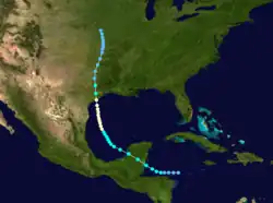 A westward-moving disturbance developed into a tropical depression over the western Caribbean Sea on June 16. About 24 hours later, the depression intensified into a tropical storm. Late on June 17, the storm made landfall in northern Belize with winds of 50 mph (80 km/h). The cyclone moved northwestward and weakened slightly while crossing the Yucatán Peninsula, but remained a tropical storm.[3] Early on June 18, the system emerged into the Gulf of Mexico and began to curve north-northwestward. Continuing to intensify, it attained hurricane status around 12:00 UTC on June 20. The hurricane drifted and strengthened further. Early on June 22, sustained winds associated with the storm peaked at 90 mph (140 km/h). At approximately 18:00 UTC, the cyclone made landfall near Matagorda, Texas, at the same intensity.[3] A ship offshore observed a barometric pressure of 980 mbar (29 inHg), which would be the lowest in relation to the storm.[4] The hurricane quickly fell to tropical storm intensity, and then weakened to a tropical depression around 12:00 UTC on June 23. However, the depression persisted for a few more days, until dissipating over northern Missouri on June 26.[3]