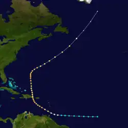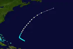 A tropical storm was first observed about 500 mi (800 km) east of the island of Trinidad on September 6. It moved nearly due westward and struck the Windward Islands on September 8 as a Category 1 hurricane. The storm moved northwestward across the Caribbean and intensified into a major hurricane on September 9. Thereafter, the cyclone began to curve northward, and early on September 11, it made landfall in the Dominican Republic near Boca de Yuma at peak intensity as a Category 3 hurricane with winds of 125 mph (201 km/h). The storm weakened to a Category 2 hurricane after striking the island, but re-strengthened into a Category 3 while northeast of the Bahamas on September 13. The storm curved northeastward on September 14 and began accelerated. On the following day, the system weakened to a Category 2 hurricane near Bermuda. Early on September 17, the system weakened to a Category 1 hurricane and soon transitioned into an extratropical cyclone about 310 mi (500 km) east of Newfoundland.[3] The remnants were absorbed by a larger extratropical storm later on September 17.[4]