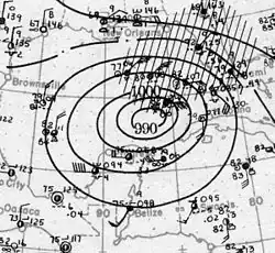 In mid-October, a significant drop in atmospheric pressures over the western Caribbean Sea coincided with the development of a trough on October 17. Observations suggested that a circulation formed on October 20,[2] with the Atlantic hurricane database listing a tropical storm beginning at 00:00 UTC, with the system was situated about 95 mi (153 km) southeast of the Archipelago of San Andrés, Providencia and Santa Catalina.[3] The cyclone initially moved slowly northwestward due to a high pressure system over Bermuda.[4] Early on October 22, the storm intensified into a Category 1 hurricane, based on sustained winds of 81 mph (130 km/h) on Great Swan Island.[2] The hurricane strengthened significantly over the northwestern Caribbean, becoming a Category 2 hurricane at 00:00 UTC on October 23 and a Category 3 hurricane six hours later. Around 18:00 UTC, the cyclone reached Category 4 intensity and peaked with maximum sustained winds of 140 mph (230 km/h) and a minimum barometric pressure of 941 mbar (27.8 inHg).[3] The latter was observed by the schooner Virginia,[2] while the former was estimated using the southern wind-pressure relationship.[2]
