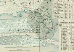 The hurricane passed to the west of the Florida Keys as a Category 4 hurricane. Its large wind field caused tropical storm force winds to the islands, with the highest wind report being 48 mph (77 km/h) in Key West. Rainfall from the hurricane's outer bands was intermittent, and storm tides of 5 ft (1.5 m) were reported.[4] Further north, Captiva and Sanibel islands were completely inundated with water. In Punta Rassa, the majority of homes were either extensively damaged or washed away. Most highways leading out of Fort Myers were impassible due to high water. Damage to railroad tracks resulted in a suspension of service for three days. On Estero Island, a number of buildings were damaged, including the casinos, cottages, and Crescent Beach resort.[8] The storm also destroyed the mausoleum of Dr. Cyrus Teed, the founder of Koreshanity.[9] Damage in Lee County reached about $1.5 million.[8] Along the Myakka River near Boca Grande, the railroad bridge washed away, while the storm also destroyed two vehicular bridges over the Charlotte Harbor Bay.[10] The streets of Punta Gorda were inundated, where a tide of 7 ft (2.1 m) above normal was recorded.[2] One death occurred in the city due to drowning.[11] At Egmont Key, above normal tides forced 75 people to seek shelter in the lighthouse. The entire island was inundated by water.[12]