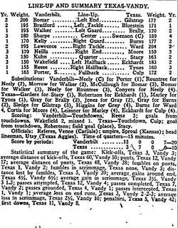 92. ^ Closed access icon "Vanderbilt Noses Out Victory Over Texans". The Columbus Enquirer. October 22, 1922.