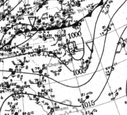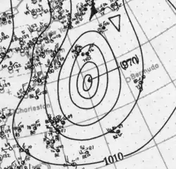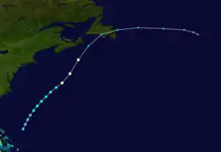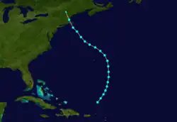 Around August 31, a low-pressure area formed along the tail end of a cold front extending from the Bahamas to Bermuda.[4] Early on the following day, a tropical depression developed roughly 510 mi (820 km) east-southeast of Jacksonville, Florida.[2] The depression moved slowly east-northeastward as the cold front dissipated.[4][2] Late on September 3, the system intensified into a tropical storm, and the next day the cyclone passed northwest of Bermuda.[2] Based on observations from the S.S. Evergreen City, the small storm likely reached Category 1 hurricane intensity early on September 5.[4] The cyclone continued to strengthen, reaching Category 2 intensity on September 6 while drifting northward and then peaking with maximum sustained winds of 105 mph (165 km/h) early the following day. On September 8, the system curved northwestward and weakened to a Category 1 hurricane. The storm then turned north-northeastward on September 9 and transitioned into an extratropical cyclone later that day. The extratropical low continued north-northeastward until dissipating over southern Newfoundland on September 10.[2] Cape Race observed sustained winds of 29 mph (47 km/h).[4]