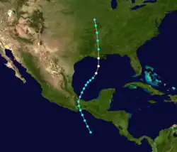 A tropical wave developed into a tropical storm in the eastern Pacific basin by October 12.[4] Initially located about 340 mi (545 km) southwest of San Salvador, El Salvador, the cyclone moved north-northwestward and made landfall near Salina Cruz, Oaxaca, early on the following day. The storm quickly weakened to a tropical depression later on October 13, but remained a tropical cyclone while crossing Mexico and reached the Gulf of Mexico on October 14.[2] At the time, it was the third tropical storm to cross from the eastern Pacific basin to the Atlantic basin; it is one of only five to have done so in recorded history.[9] Curving northeastward, the system soon re-strengthened into a tropical storm. Late on October 15, the storm reached hurricane intensity and peaked with winds of 80 mph (130 km/h) early the next day. Around 06:00 UTC, the hurricane made landfall near Cocodrie, Louisiana, at the same intensity. The system weakened to a tropical storm about six hours later. Now moving quickly north-northwestward, the storm fell to tropical depression status on October 17 and dissipated over Missouri shortly thereafter.[2]