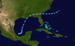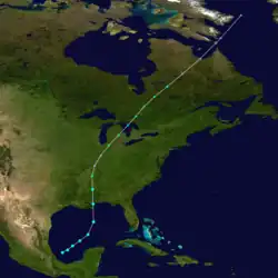 A tropical storm was first observed in the Bay of Campeche around 12:00 UTC on October 16. For a brief time on October 16, there were three tropical storms active in the Atlantic simultaneously. The storm tracked northeastward and progressively moved faster throughout its duration as a tropical cyclone. Late on October 17, the system peaked with maximum sustained winds of 60 mph (95 km/h) while curving northward. Around 01:00 UTC on the following day, the storm made landfall near Mississippi City, Mississippi, at the same intensity. Although the system transitioned into an extratropical cyclone just 11 hours later over western Tennessee, the extratropical low moved northeastward across the Midwestern United States and eastern Canada; it was last noted over Baffin Bay late on October 21.[2]