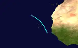 Early on September 7, a tropical depression developed over the far eastern Atlantic about 225 mi (360 km) southwest of Banjul, The Gambia. The depression moved north-northwest and intensified into a tropical storm later that day. Around 12:00 UTC on September 8, the cyclone peaked with maximum sustained winds of 50 mph (85 km/h). The storm then curved northwestward early the next day. Late on September 10, the system weakened to a tropical depression and then dissipated at 00:00 UTC on September 11 while situated about 410 mi (660 km) northwest of Santo Antão in the Cabo Verde Islands.[2] This system was not entered into the Atlantic hurricane best track until reanalysis of the season in 2009.[4]