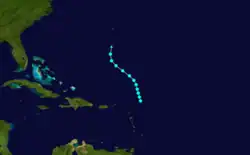 Late on September 24, a tropical wave developed into a tropical storm near Great Inagua Island in the Bahamas.[4] Moving northwestward, the storm gradually intensified and crossed Acklins early the next day. Around 00:00 UTC on September 26, the system intensified into a Category 1 hurricane near Rum Cay. Several hours later, the hurricane turned northward and passed east of the northern Bahamian islands. The cyclone curved east-northeastward early on September 28, around the time that it strengthened into a Category 2 hurricane. Reaching major hurricane intensity early on the following day, the storm peaked as a Category 3 hurricane with winds of 120 mph (195 km/h). The system began weakening by September 30, falling to Category 2 status while passing northwest of Bermuda. Thereafter, the hurricane accelerated northeastward and lost tropical characteristics, transitioning into an extratropical cyclone roughly 155 mi (250 km) south-southeast of Sable Island on October 1. The extratropical system continued northward and struck Newfoundland late on October 2, before resuming a northeastward motion and dissipating near Greenland on October 4.[2]