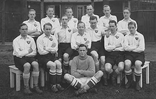 Regular league team line-up including reserves of B.93 in 1928, the winners of the 1927/28-season of KBUs Mesterskabsrække. Back row (standing from left to right): Leo Hansen, Michael Rohde, Svend Petersen, Anthon Olsen, Georg Hansen, William Gram. Center row (sitting from left to right): Ejnar H. Hansen, Fritz Tarp, Poul Zølck, Poul Jensen, Helge Scharff, Charles Jensen, Knud Andersen. Front row (sitting on grass): Svend Jensen.[12]