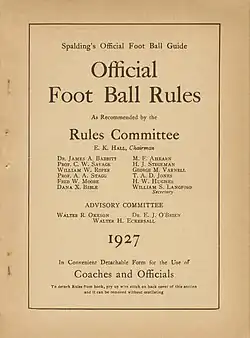 - ^ a b c E.K. Hall, et al., "Principle Changes in the Rules for 1927," in Official Football Rules as Recommended by the Rules Committee, 1927. National Collegiate Athletic Association, 1927; inside cover.