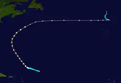 The first hurricane of the season was first noted in the central Atlantic Ocean on August 21. Slowly intensifying, the system initially moved towards the west.[2] On August 22, a steamship in the vicinity sustained some structural damage.[4] After attaining hurricane strength on August 24, the system turned northwestward, and reached Category 3 intensity on August 25 with maximum sustained winds of 125 mph (205 km/h) as it grazed Bermuda.[2] Recurving to the northeast, the French transatlantic ocean liner SS Paris encountered the hurricane while it was a Category 2 hurricane. A large wave struck the ship, shattering glass on the vessel and injuring 40 passengers.[5][4] Although still a Category 2 hurricane, the system became extratropical shortly after on August 28.[2] The extratropical storm was tracked due east towards the Azores for a few days while gradually weakening before abruptly turning to the north and dissipating.[4]