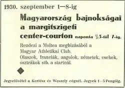 The 1930 Hungarian International Tennis Championships was a tennis tournament played on outdoor clay courts which took place at the Margitsziget courts. It was part of the Hungarian International Tennis Championships series. The event was preceded by two years of promotion, which led to a greater number of foreign participants. As a result of the raised prize money the Hungarian Athletics Club decided to only organize the tournaments while the Hungarian Lawn Tennis Association took over the sponsoring task. The draw was announced on 1 September. The directors were disappointed by the many walkovers, which occurred in the early stages of the competition and the low performance of Hungarian players in overall.[1]
