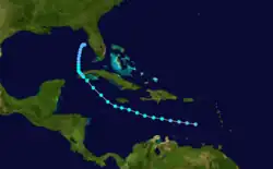 On July 24, a tropical storm was detected. Located to the southeast of Antigua, it tracked west-northwestward and strengthened, attaining hurricane status over the Leeward Islands; it passed near Saba and St. Thomas with winds of 85 mph (137 km/h). The storm continued its west-northwest movement the next day north of Puerto Rico, later bypassing the Turks and Caicos Islands. After moving through the northern Bahamas, the hurricane struck near Hobe Sound, Florida, with winds of 75 mph (121 km/h). The hurricane crossed the state and weakened to minimal tropical storm intensity. It turned to the west-southwest and re-strengthened to a hurricane on August 4 off the coast of Texas. After peaking with winds of 90 mph (140 km/h), it made landfall just south of the Mexico–United States border on August 5. The system rapidly dissipated over northern Mexico.[10]