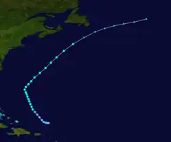 On August 23, another tropical storm was observed north of Puerto Rico. It moved northwestward for three days, slowly strengthening as it moved over the open ocean. The storm turned to the northeast and reached peak sustained winds of 50 mph (80 km/h) a short distance to the west of Bermuda. It began weakening shortly thereafter, and on August 30 the storm became extratropical to the southeast of Newfoundland. It continued to the northeast and was last observed on August 31 over the north-central Atlantic Ocean. It did not cause significant effects on land.[10][17]