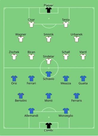Both teams changed their usual line-ups, resting several players. Austrian players wore an unusual light blue jersey borrowed from Napoli because of the clash of colours between the two traditional jerseys. Germany took the lead inside 25 seconds with the fastest goal of the tournament, scored by Ernst Lehner. They doubled the lead with Edmund Conen, but Austria got one back immediately after with Johann Horvath. Germany's third goal came after Karl Sesta attempted to sit on the ball to ridicule a German player; the ball was stolen by Conen, who crossed to Lehner. Sesta then scored a goal, but Germany held on for the victory.[2]