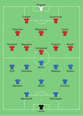 The replay was played the day after the first game. The exhaustion and the injuries resulting from the first tie forced Italy and Spain to make four and seven changes respectively. Most notably, the experienced Zamora had to give way to the uncapped goalkeeper Juan José Nogués. Once again, the game was marred by controversial refereeing decisions. In the first five minutes, Crisant Bosch was hacked down by Eraldo Monzeglio in the penalty box. The penalty was not given, but the tackle resulted in the injury of Bosch. With no substitutes available, Spain had to play the remainder of the game with 10 men. Giuseppe Meazza scored soon after from a corner kick situation. In the second half, two Spanish goals were disallowed: one for offside and the other for a foul on a Spanish player. The referee, René Mercet, was suspended in the aftermath of the tournament.[2]