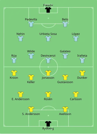 Argentina proved a shadow of the team that was finalist in the 1930 World Cup. In fact, they presented a roster of newcomers as only Alfredo Devincenzi and Arcadio López were previously capped by the team. Argentina took the lead with a 25-yard free kick by Ernesto Belis. A more organised Sweden team soon equalized with Sven Jonasson. Argentina showed an excellent attacking prowess and went ahead again with an individual effort from Alberto Galateo. However, an efficient Sweden team took advantage of the defensive weakness of Argentina to score twice before the final whistle and hold on for the victory.[2]