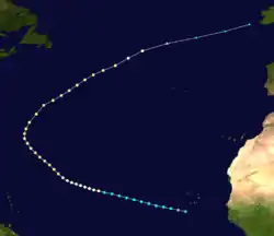 This Cape Verde hurricane was first detected in the eastern tropical Atlantic on August 25. Moving northwest on August 29, the system continued to strengthen, eventually reaching a peak of 110 mph (175 km/h) as a Category 2 hurricane in the central North Atlantic on September 1. The hurricane then began to curve northeast late on September 1 while maintaining intensity, eventually weakening to a 90 mph (140 km/h) Category 1 hurricane on September 5. The system became extratropical on September 6, and the system dissipated while nearing the British Isles.[9] As the system never affected land, no damage or casualties were reported.[1]