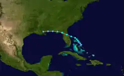 On June 9, a tropical cyclone with atmospheric pressure below 988 mb (29.18 inHg) made landfall on the Pacific coast of Guatemala.[4] It moved northeastward across Central America, but dissipated before reaching the western Caribbean Sea on June 12. The storm quickly re-organized, and again developed into a tropical storm on June 12. It moved north-northeastward, resulting in light winds as it paralleled the eastern coasts of Belize and the Yucatán Peninsula. After reaching the Gulf of Mexico with peak winds of 45 mph (75 km/h), the storm turned to the northeast, then to the east. On June 15, the tropical storm made landfall about 20 mi (32 km) to the south of Fort Myers, Florida, and after crossing the state it passed over Miami before entering the Atlantic Ocean.[4] It weakened as it accelerated northeastward through the Bahamas, and on June 17 the system dissipated to the north of Bermuda.[1]